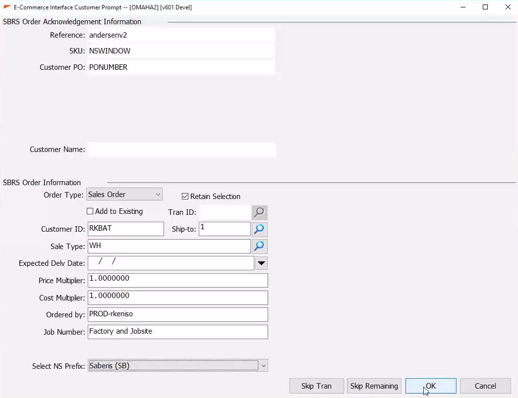 • Fill in your Customer ID and Ship-to record and use the interface defaults for the remaining fields, then hit Okay.