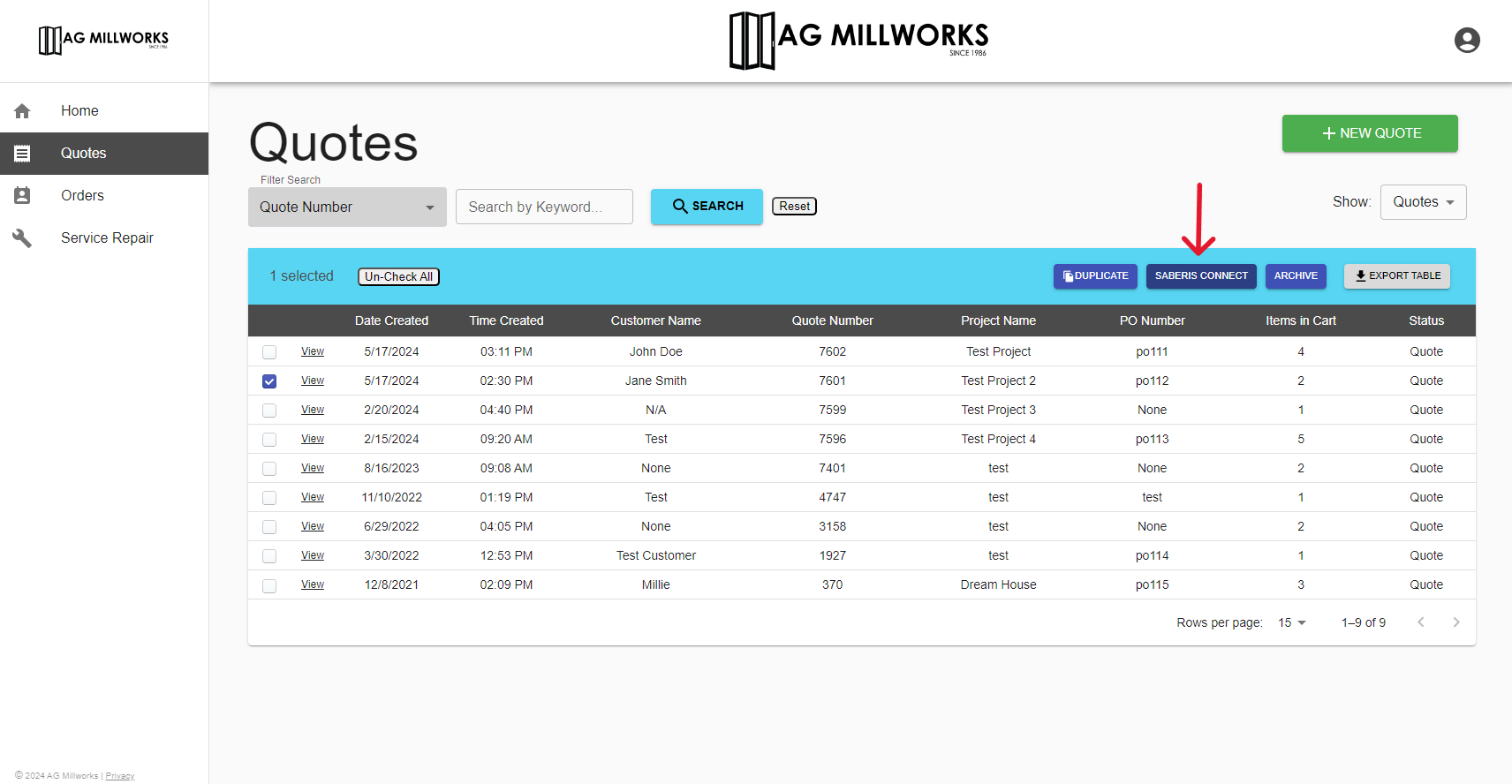 Once selected, a "Saberis Connect" button will appear above the quotes or orders table.