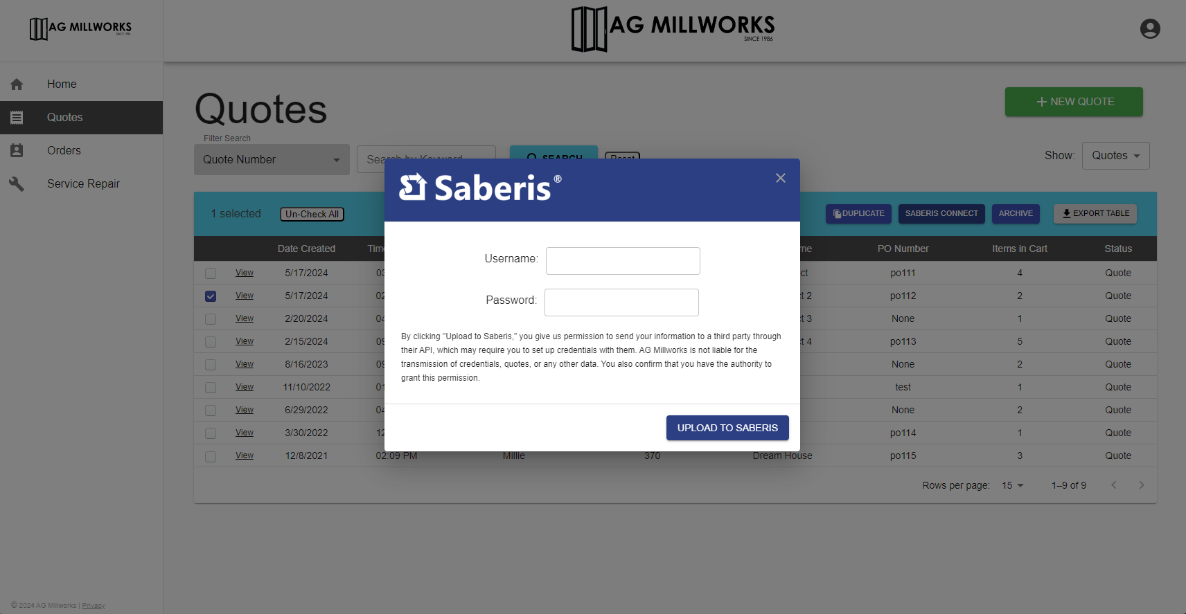 - Select the checkbox next to the quote or order you want to upload to Saberis.