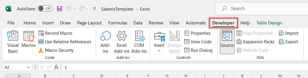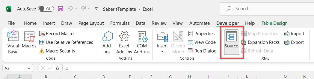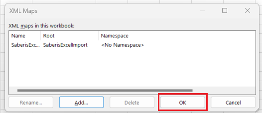 Download and save the Saberis Excel Template XML document to a convenient folder. This document will be loaded into every spreadsheet. It will allow for the mapping of your columns to the required XML export for SaberisConnect.