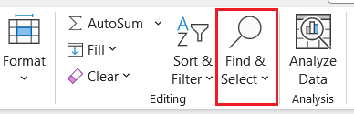 For Excel to continue highlighting data, you can do a find and replace for column A. Highlight column A by selecting it. Now click on the Home Tab, and at the far right should be the Find & Select command.