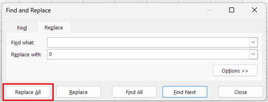 Select the Replace command and enter a zero "0" in the "Replace with" box. Leave the "Find What" box empty.