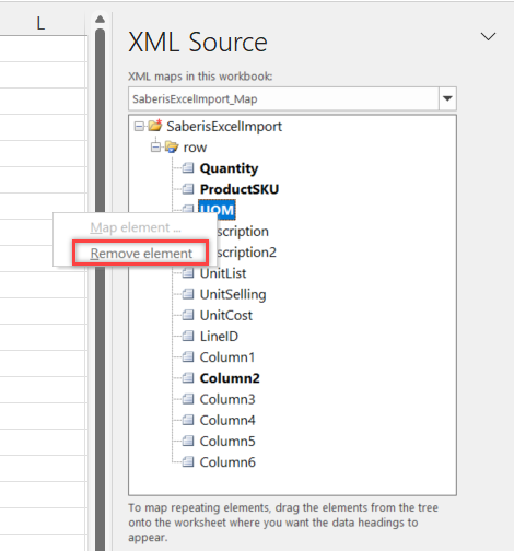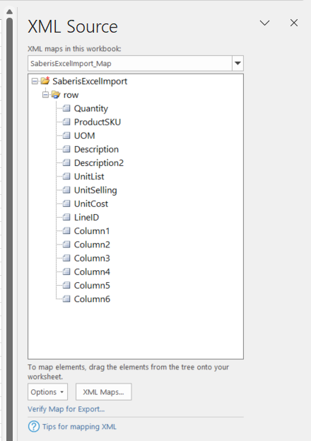 When you export the Excel file with data and the mapped columns, you will be prompted to save the export XML. Then if you wish to have a copy of the original order information but don't need both the Excel and XML file, you can discard your changes when you close the Excel file. This allows you to keep a copy of the XML file for processing in SaberisConnect and also reuse the Excel "template" file with the xml source elements loaded. For each new order or quote, you can copy and paste your data into the "template" file.