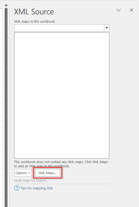 On the right hand side, the XML Source window will appear. Click on the XML Maps button.