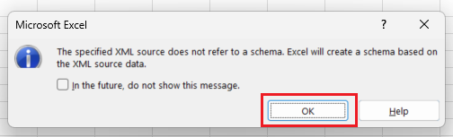 Find the SaberisExcelTemplate.xml document that you downloaded and select it. You will receive this informational message. Click OK.