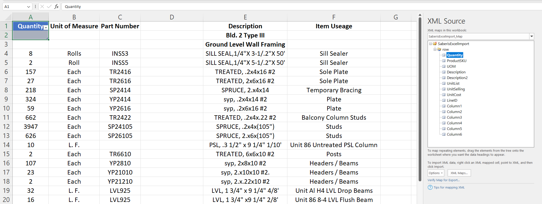 You can also click on the A1 cell and then double click on the Quantity element in the XML Source window. This second method will automatically apply the mapping to the entire column containing data as long as there are no blank cells.