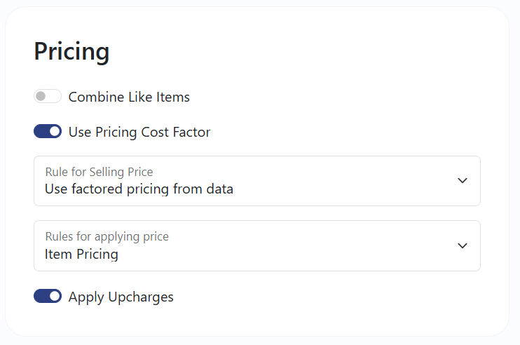 Do not apply a factor: Use this if you want list price sent to the ERP system. You will then use the ERP system's tools to set the selling price by Gross Margin, mark up on cost, or by a bottom line total price.