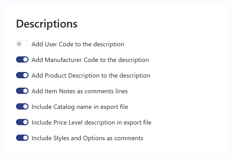 This option page controls the item descriptions. There are also settings for the different comment or text lines that are sent to the ERP system at the top of each group of items. Each catalog in the 2020 design forms a group in the data.