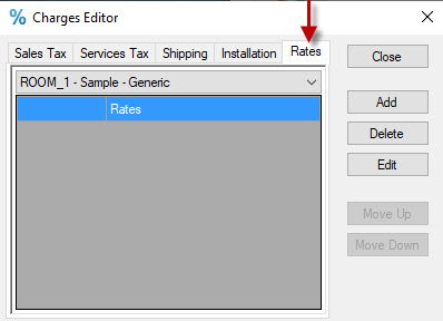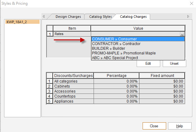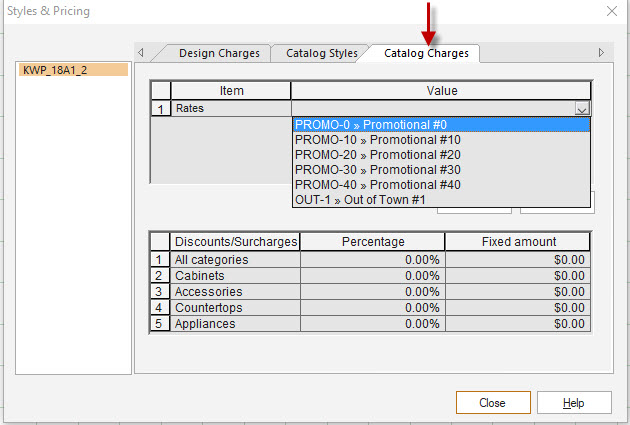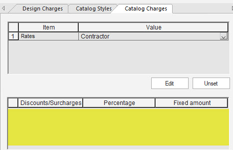 Once these rate records are setup, then all the designer has to do is select the Catalog Charges tab in Styles and Pricing. Then select the correct Rate record in the drop down menu.