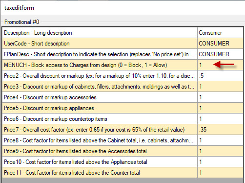 Repeat for example, Contractor, Builder, Promotional Maple, ABC Special Project. The only difference in the settings other than the price factors would be the MENUCH setting. You can "lock" down the selling and cost for Builder and the Special project because they are fixed by agreement.