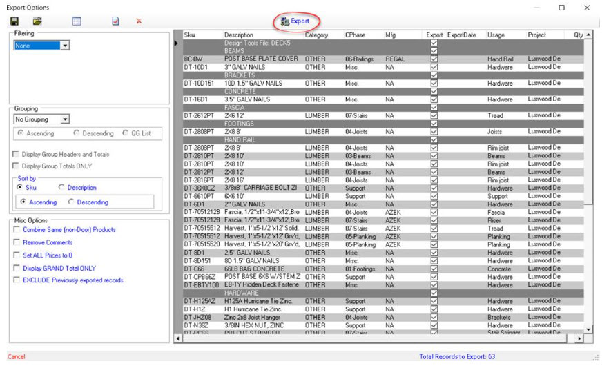 Once these have been set, from then on whenever the user wants to transfer a BOM, they would click on File /Export and the following window opens. Here the user can filter the data, choose certain skus to transfer, holding some back for later etc. When ready, the user clicks Export at the top of the screen and the file is transferred in the file format required by the destination program to the default destination.