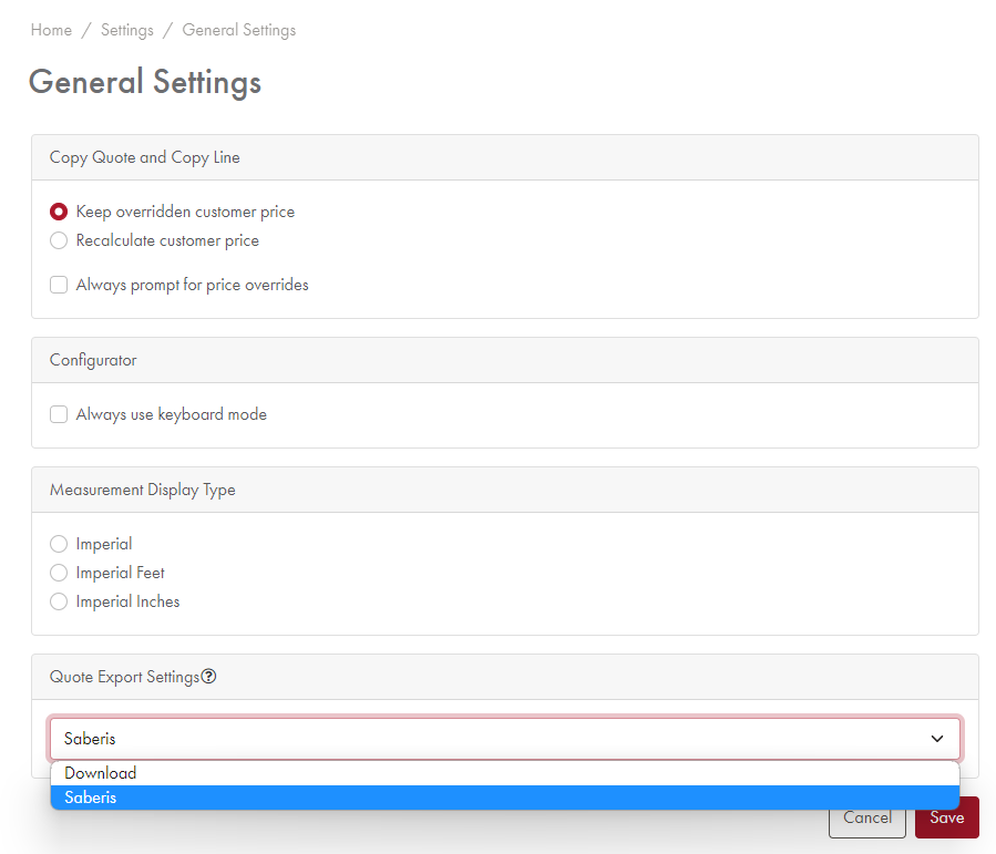 Scroll down in the General Settings to "Quote Export Settings" and select "Saberis", then select "save".