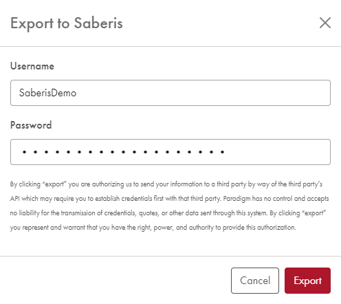 When prompted, enter your SaberisConnect credentials, then select "Export".