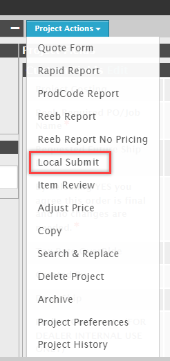 Navigate to the Project Actions menu and click on Local Submit. This feature will only appear for valid 2g projects. Please ensure that pricing has been updated and that required fields, such as Job Name, are filled.