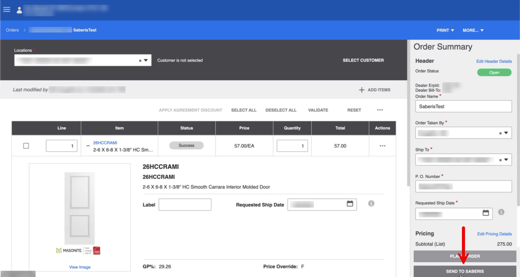 Once selected, a "Send to Saberis" button will appear bellow the "Place Order" button.