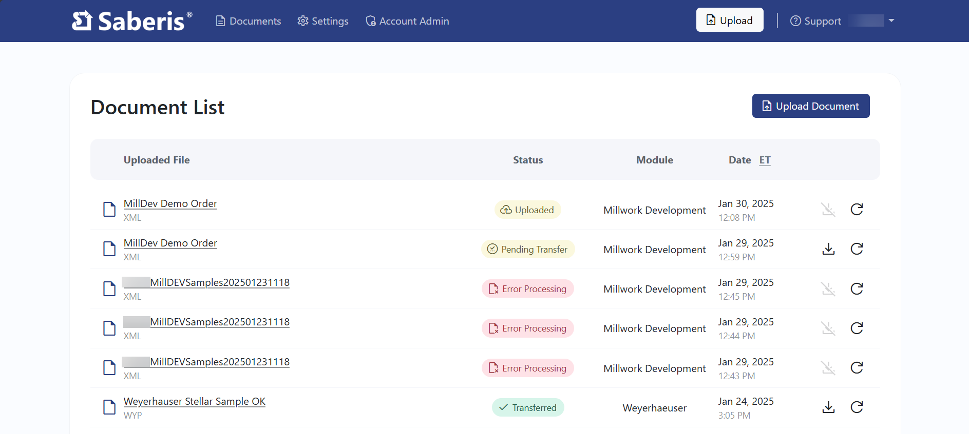 - Click on a processed file in the corresponding column to download and to import it into your POS/ERP system. This will not be necessary if your ERP/POS system uses an API or FTP to receive the documents automatically. For example, Epicor BisTrack "pulls" down the Saberis documents automatically every 30 seconds. Downloading documents is also not needed if you are using the Saberis FTP function (you will need an FTP server setup for this). Please see POS/ERP Systems for more details.